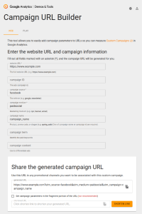 A great online tool that can help ensure UTM tracking is set up correctly is the “Campaign URL Builder” found here. In the following screenshot, you can see input fields for each of the different utm parameters. Once you start filling this out, it generates a URL with UTM tracking enabled.