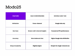 Google Analytics 4 (GA4) offers a more holistic view of user behaviour by tracking interactions across multiple channels, not just Google Ads. This makes it ideal for businesses running cross-channel campaigns, as it helps you understand how different platforms contribute to conversions. In contrast, Google Ads tags are built specifically to measure activity within the Google Ads ecosystem. If you’re only running paid search campaigns, the Google Ads tag can give you clean, direct insights. But if you’re juggling SEO, social, and email alongside paid ads, GA4 provides a more complete picture.